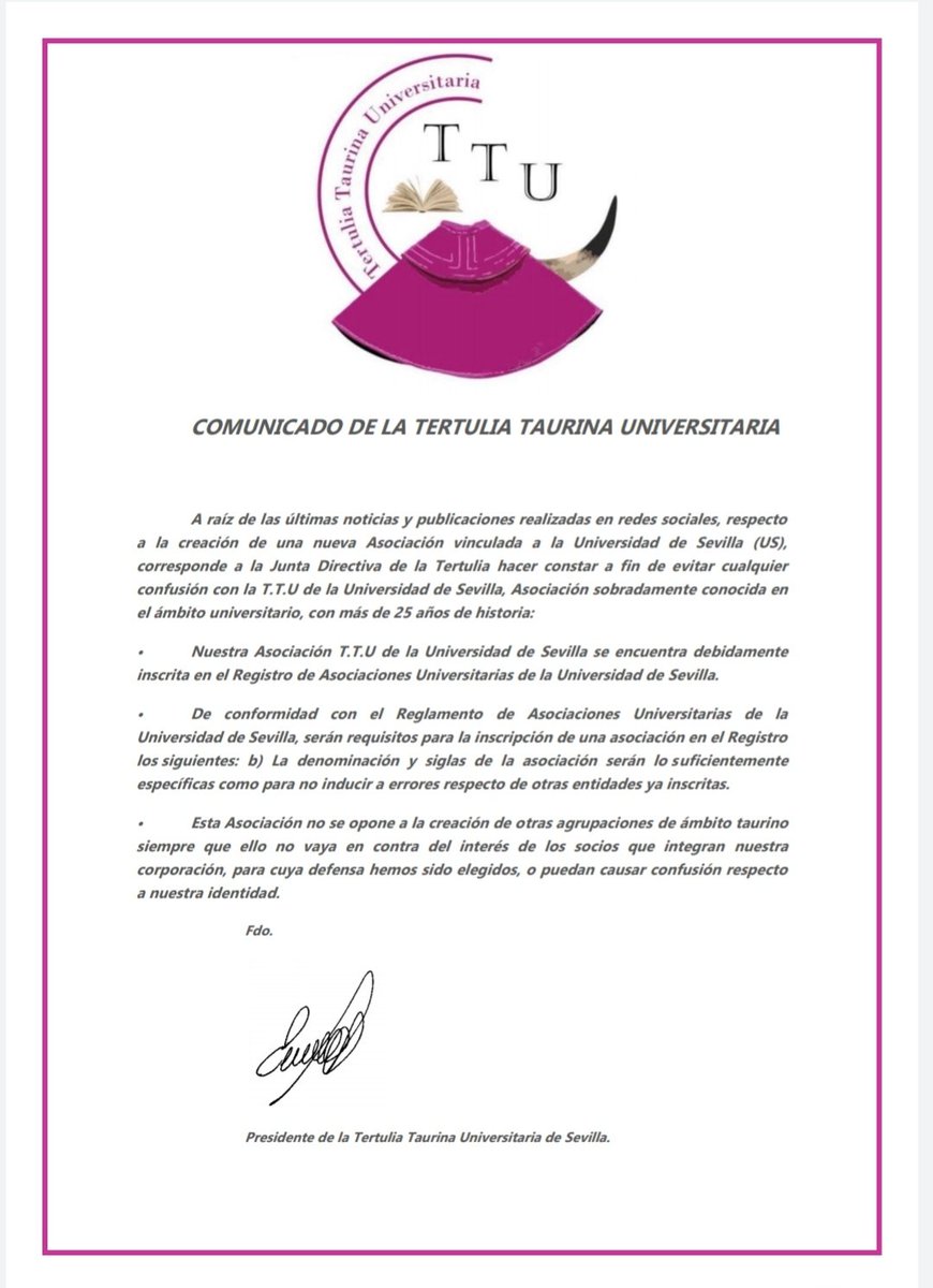 La Tertulia Taurina Universitaria de Sevilla ha difundido este viernes el siguiente comunicado: